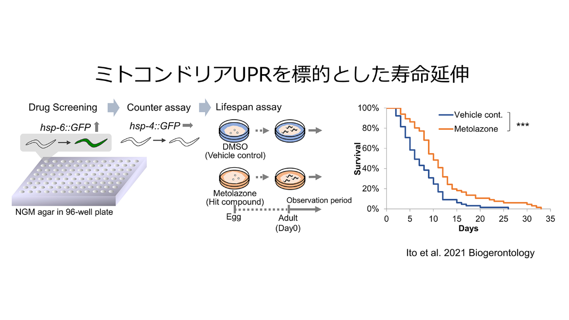 ミトコンドリアは老化と密接に関わり、老化制御の有望なターゲットでもあります。これまでに、ミトコンドリアUPRの活性化により寿命を延伸する医薬品化合物を、線虫C. elegansを用いたスクリーニングにより同定しました。線虫は寿命などの個体特有の生命現象に簡便かつ迅速にアプローチできる有効なモデル生物の1つです。