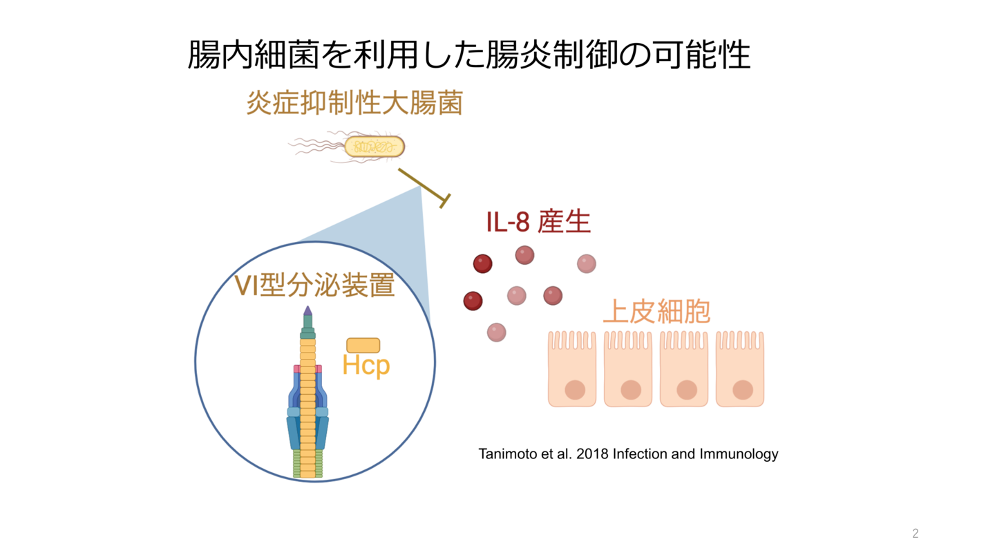 近年増加している炎症性腸疾患の予防や病態緩和は重要な課題の1つです。大腸菌はその下痢原性がクローズアップされることが多いのですが、これまでに、炎症性サイトカインの誘導抑制活性を示す大腸菌株群があることを見出しています。さまざまな腸内細菌の中から炎症を抑制する菌種菌株も探索していきます。