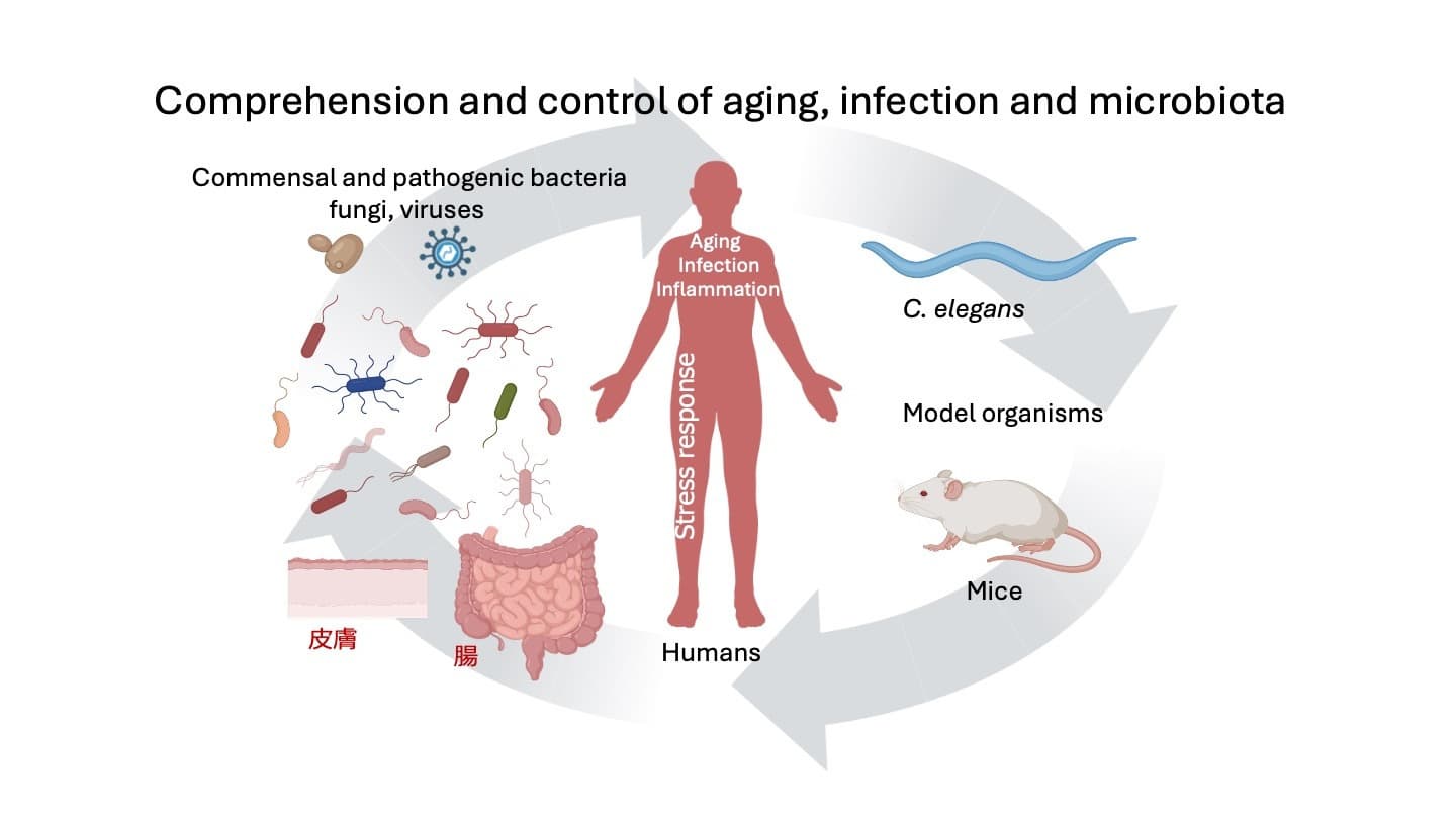 Using C. elegans and mice as model organisms, we are studying the mechanisms of aging, infection, and stress responses, and how to control them. In recent years, it has become clear that inflammation is closely related not only to infection but also to various chronic diseases, and we are focusing on the possibility of using intestinal bacteria to regulate inflammation.